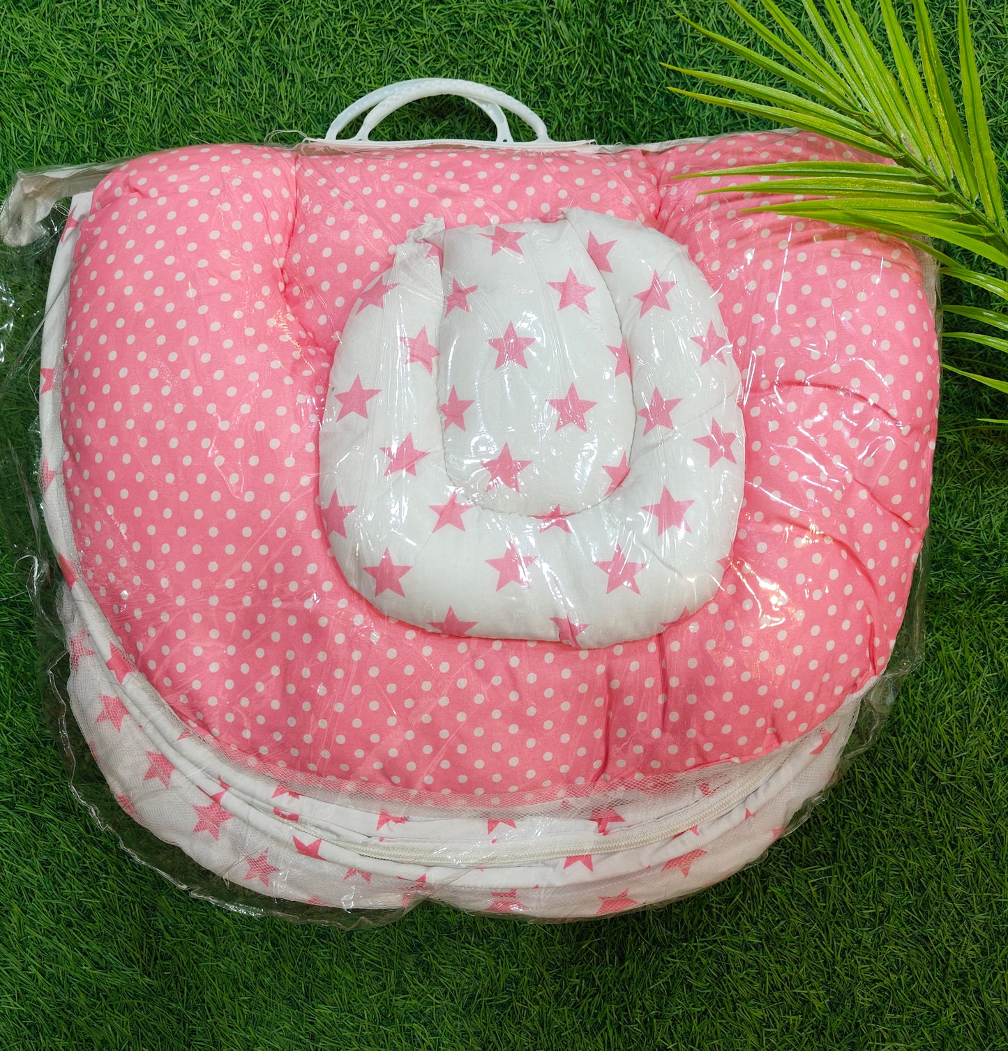 Description: This cozy and comfortable baby bed is designed for newborns and toddlers (0-2 years old), offering a safe and snug sleeping environment. The bed comes with an integrated mosquito net, ensuring that your little one is protected from mosquitoes and other insects during naps or overnight sleep. The soft, cushioned bedding features a playful design with blue stars on awhile the mosquito net has a blue polka dot pattern for added charm.